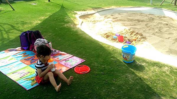 這張是陪孩子玩了1個多小時後,孩子終於說累了,要坐下來喝水休息