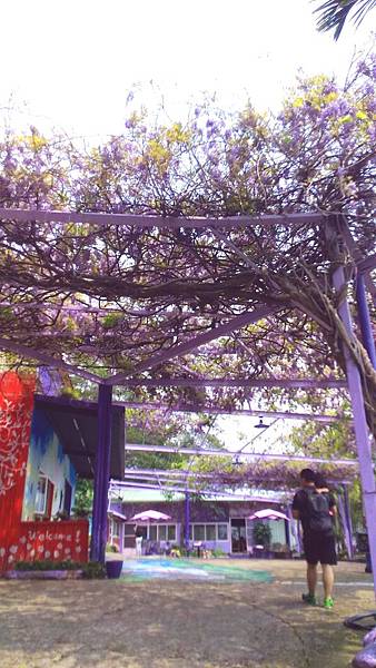 踏上小坡道頂端 紫藤花佈滿紫色的高架