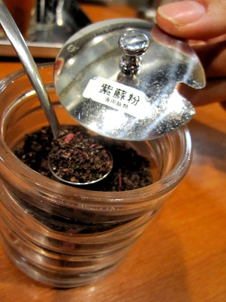 紫蘇粉加在麵裡整個口感變的很妙,有種喝茶的感覺~建議吃到一半以後再加,可以來點不一樣的味道~
